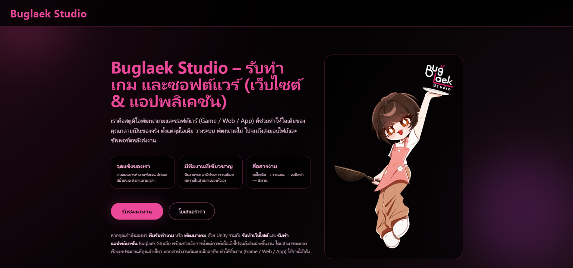 ออกแบบและพัฒนาเว็บไซต์ Buglaek Studio เป็นเว็บเชิงธุรกิจและโชว์ผลงานของสตูดิโอ